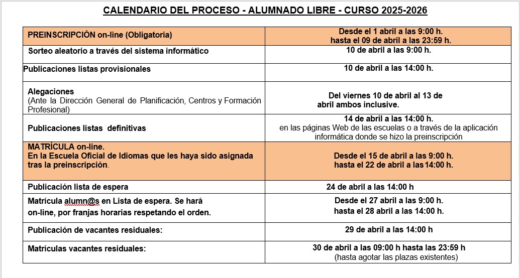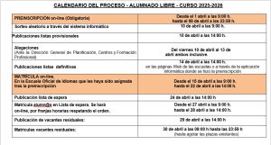 • Plazo de Matrícula: del 15 de abril a las 9:00 h. al 22 de abril hasta las 14:00 h.